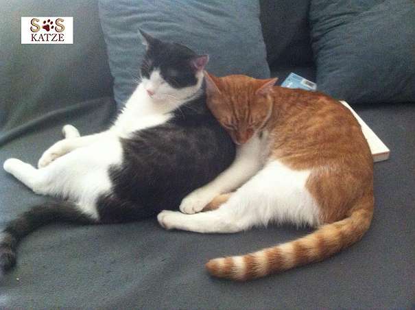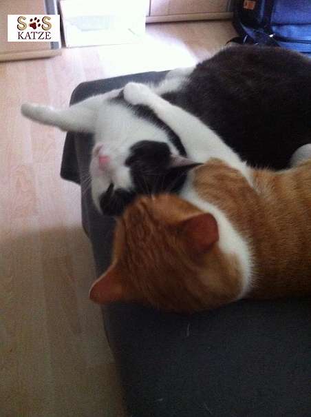 Wir sind ganz große Schmuser und am liebsten schlafen wir bei unseren Pflegeeltern im Bett. Mama meint immer, wir schnurren sie so schön in den Schlaf.