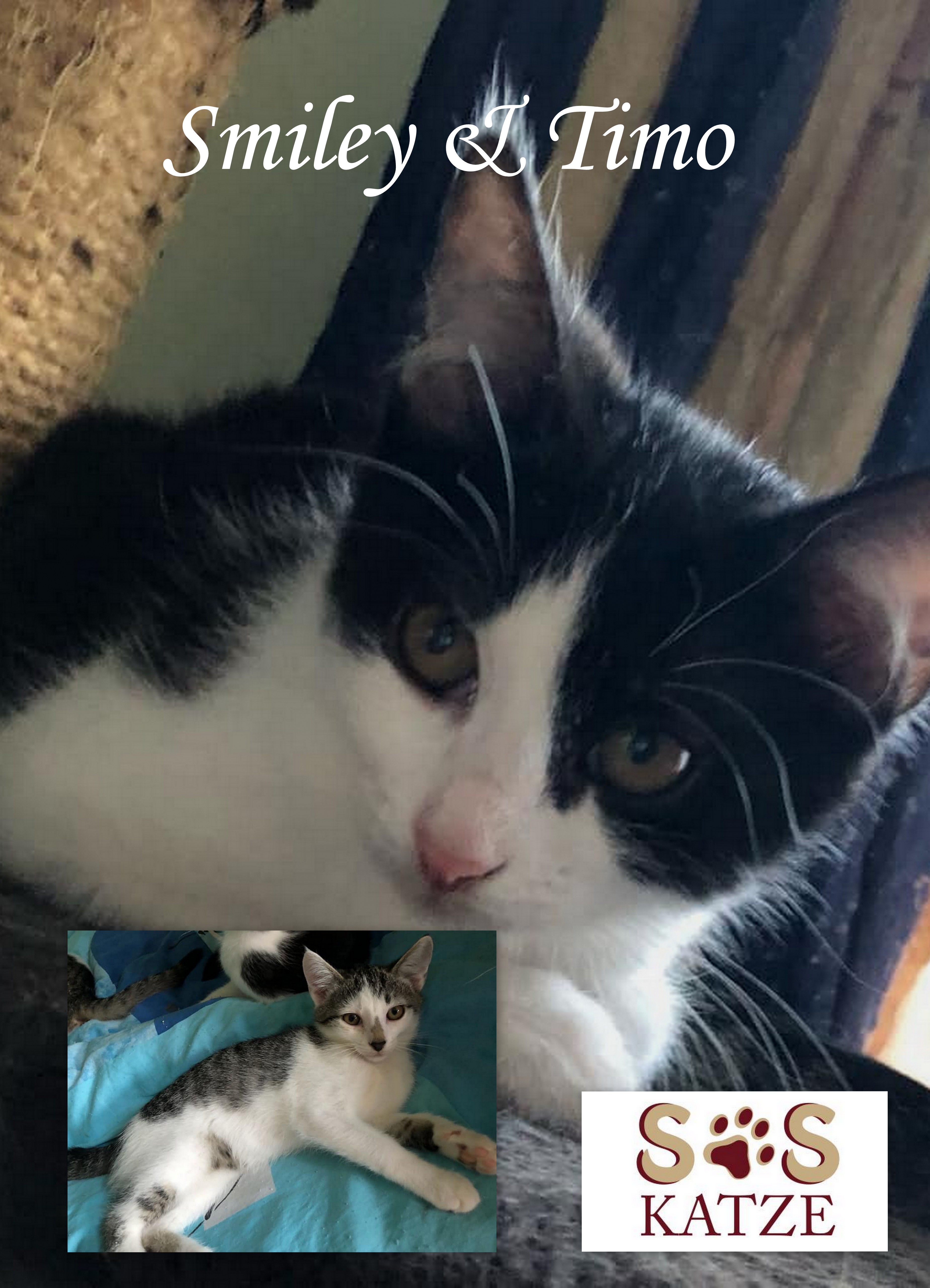 Smiley (schwarzweiß) und ihr Bruder Timo sind die Babys von einer Streunerin. Da sie neben einer stark befahrenen Strasse lebten, mussten wir handeln. So kamen sie mit ihren zwei weiteren Geschwistern zu unserer Pflegestelle in Kapfenberg.
