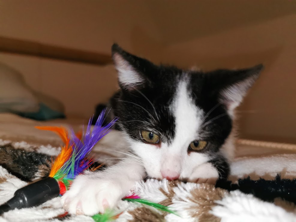 Ich brauche unbedingt Gesellschaft von mindestens einer weiteren Katze, die gerne und viel spielen mag und mit mir kuscheln soll. Mein Spielpartner muss in etwa so alt sein wie ich – zwischen 3 und 6 Monaten wäre ideal!