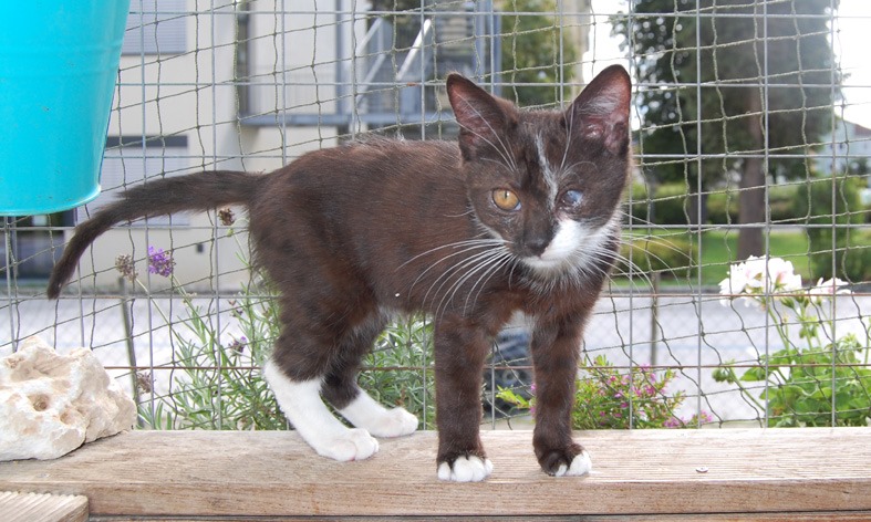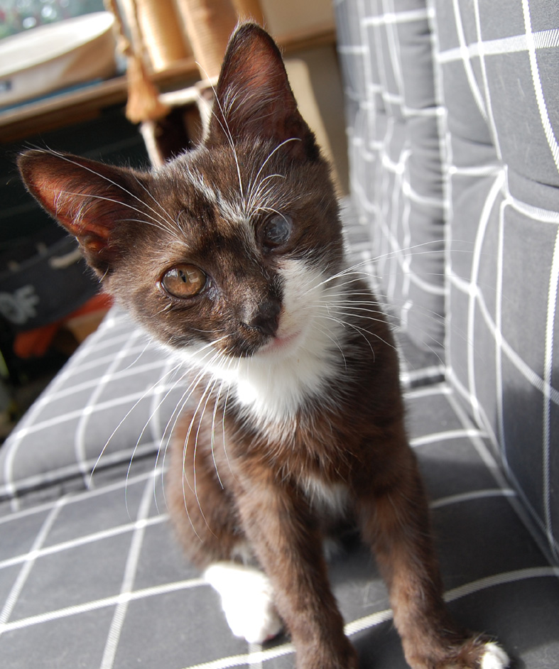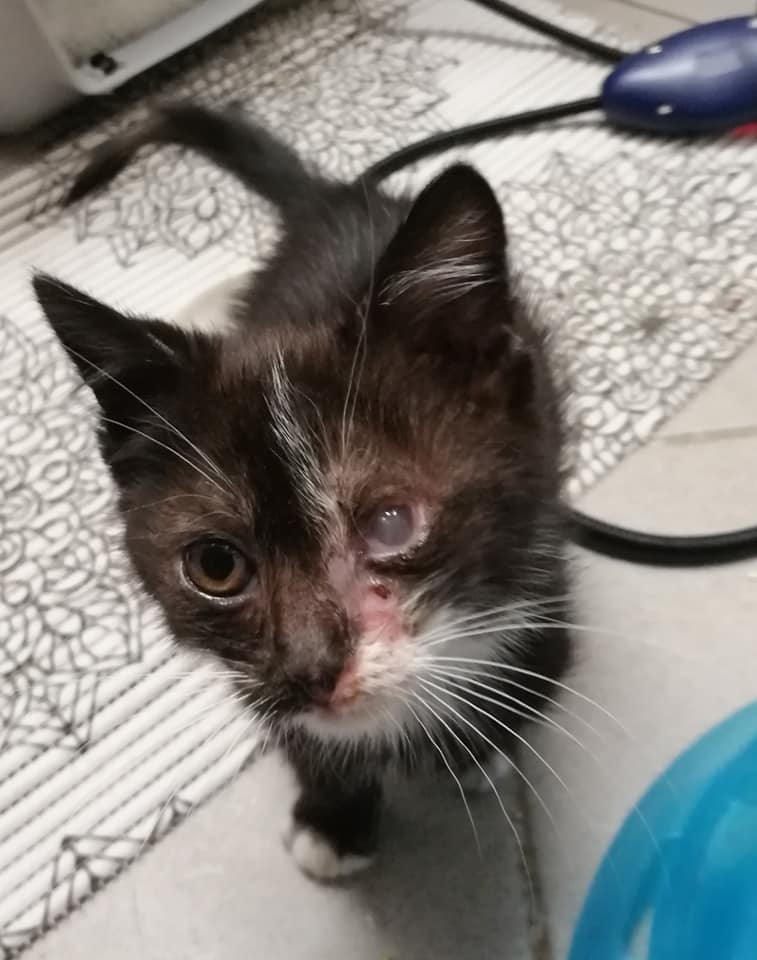 Der kleine Findus wurde in erbärmlichem Zustand auf einer Straße gefunden - beide Augen total verklebt, starker Katzenschnupfen, viele kahle Stellen, Abschürfungen